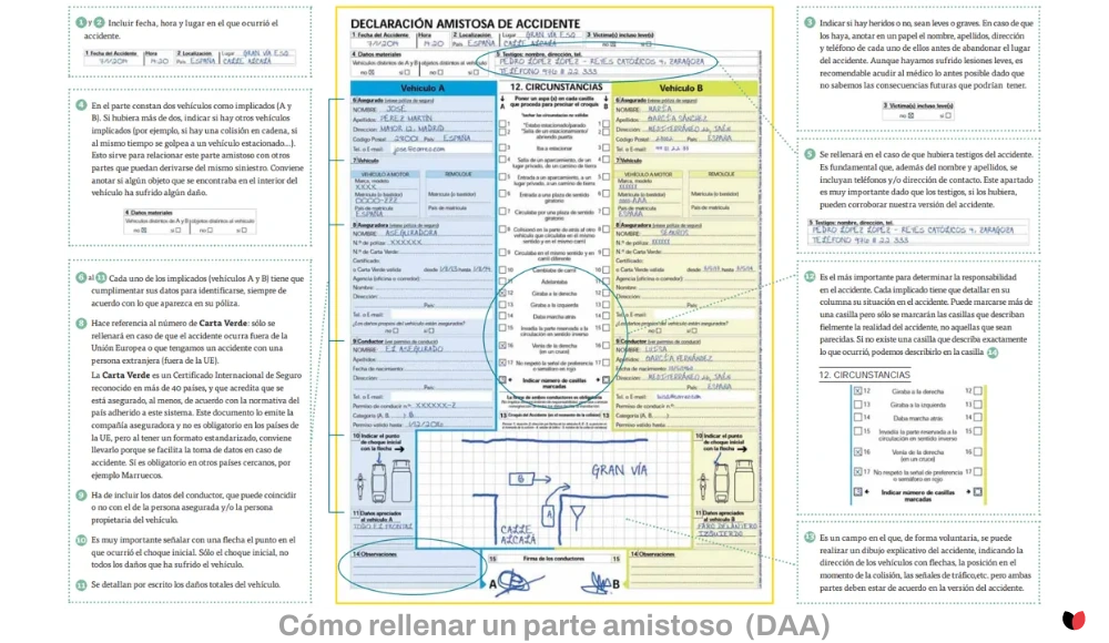 En caso de accidente, debes contactar inmediatamente con tu aseguradora para informar del siniestro, tomar fotos del incidente, obtener información de los involucrados y rellenar el parte de accidente.